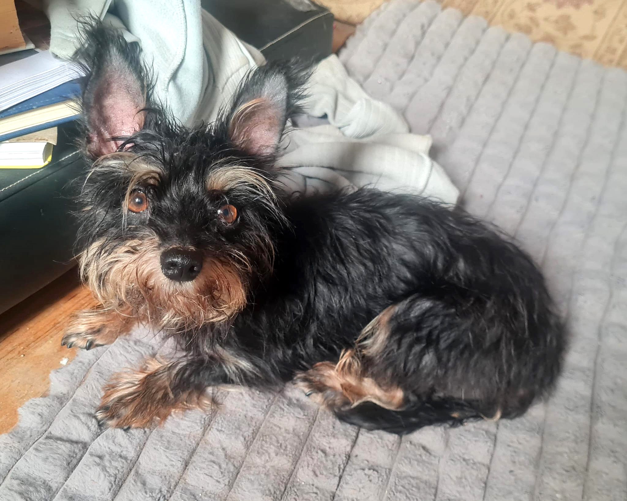 HINTERGRUND: Zaria stammt aus einer illegalen Hundeherde, die sich unkontrolliert vermehrte. Alle Tiere wurden in ein Tierheim gebracht. Wir haben Zaria, Arya und Bulnes von dort gerettet. Zaria lebt derzeit in einer Pflegestelle mit anderen Hunden. Ihr Unterkiefer ist etwas kürzer als ihr Oberkiefer. Sie frisst problemlos, sieht aber von der Seite ein bisschen wie eine Maus aus. Wegen ihres Fells fällt das nicht sofort auf.